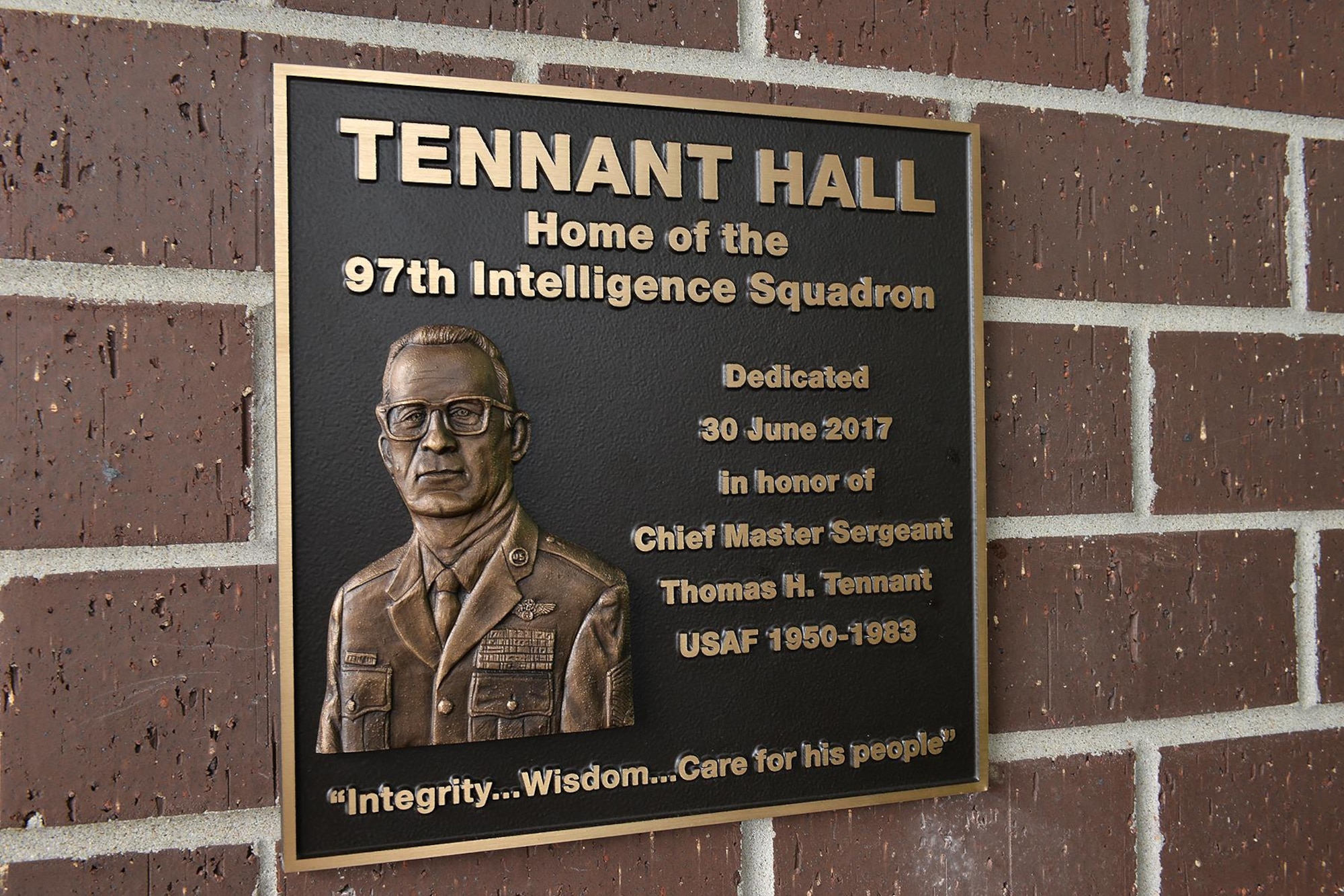Building dedication honors unit legend Published July 6, 2017 55th Wing Public Affairs OFFUTT AIR FORCE BASE, Neb. -- A dedication ceremony was held at the 97th Intelligence Squadron headquarters facility here June 30. The facility was dedicated Tennant Hall in honor of retired Chief Master Sgt. Thomas H. Tennant who played a major role establishing intelligence, surveillance and reconnaissance operations in multiple units which later became the 97th IS. “Today we recognize a chief, an operator, leader and friend who gave so much to his Airmen and mission,” said Lt. Col. Jennifer Saraceno, 97th IS commander. “I never had the chance to meet Chief Tennant, but I wish I did. If he were serving today, I would want him by my side. He was the type of chief every squadron commander wants on their team.” Tennant served 31 years in the Air Force, enlisting in 1950 as a Russian linguist. In 1958, he became an airborne cryptologic linguist and over the next 24 years logged more than 7,500 flight hours. “We are honoring … the godfather of airborne operations,” said retired Maj. Dick Oliver, who served with Tennant during multiple assignments. “It’s absolutely appropriate for us to recognize Tom for his service and name this building in his honor.” Tennant first arrived at Offutt in 1964 serving with Detachment 1 of the 6940th Security Wing, which would become the 97th IS. He led a team of 12-14 Airmen, working at the Strategic Air Command headquarters providing non-flying analysis support. The following year Tennant helped establish the 6949th Security Squadron at Offutt. Their mission was to provide security service crews for SAC’s Big Team RC-135C Burning Pipe missions. Tennant went on to serve in Vietnam before returning to Offutt in 1973. For his second tour here, he served as the NCO-in-charge of the 6944th Security Wing, managing the wing’s new RC-135V Rivet Joint fleet. After a tour in Thailand, Tennant returned to Offutt for his third and final assignment. While managing all Rivet Joint service crew support, he also spearheaded the NSA’s request for Spanish linguists during Nicaragua’s ongoing civil war. “We have nothing but love and appreciation for what Chief Tennant did on behalf of us,” said retired Chief Master Sgt. John Schultz, a former Spanish linguist, who worked with Tennant during the civil war. “His magical management, unwavering support and outstanding leadership enabled us to accomplish our mission. This building is well named and I’m sure the people who are in it will continue with his spirit and can-do attitude.” When Tennant retired in 1983, he had served as NCO-in-charge of every heritage ISR unit whose lineage is tied to the 97th IS. “This honor and dedication to the life and work of Chief Tennant … is incomprehensible,” said Penni Tennant-Schumacher, one of Tennant’s children, who was in attendance at the ceremony along with his wife. “The amount of time and effort and dedication and contributions of so many made this possible and we are humbled that you worked so hard to make this happen for him.” Today, the 97th is one of the largest squadrons in the U.S. Air Force with more than 550 Airmen. On a daily basis they are deployed downrange providing combat ready aircrew to provide ISR support to warfighters and national leadership.