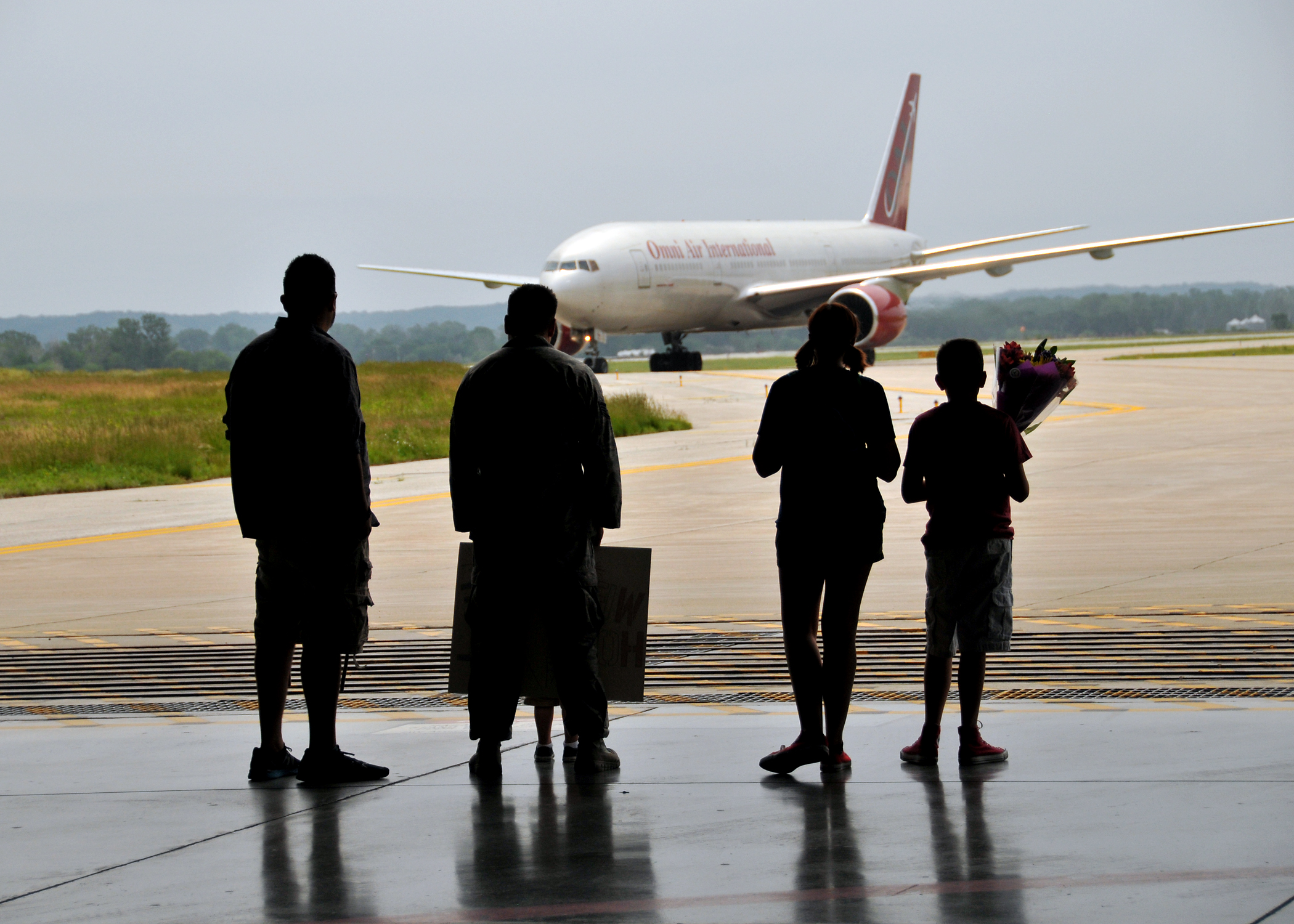 Family members of a U.S. Air Force staff sergeant assigned to the 343rd Reconnaissance Squadron wait for arrival at the Bennie Davis Maintenance Facility at Offutt Air Force Base, Neb., June 14. Team Offutt family members, friends and coworkers welcomed nearly 200 Airmen upon their return from a deployment to Southwest Asia. (U.S. Air Force photo by Tech. Sgt. Markus M. Maier/Released)
