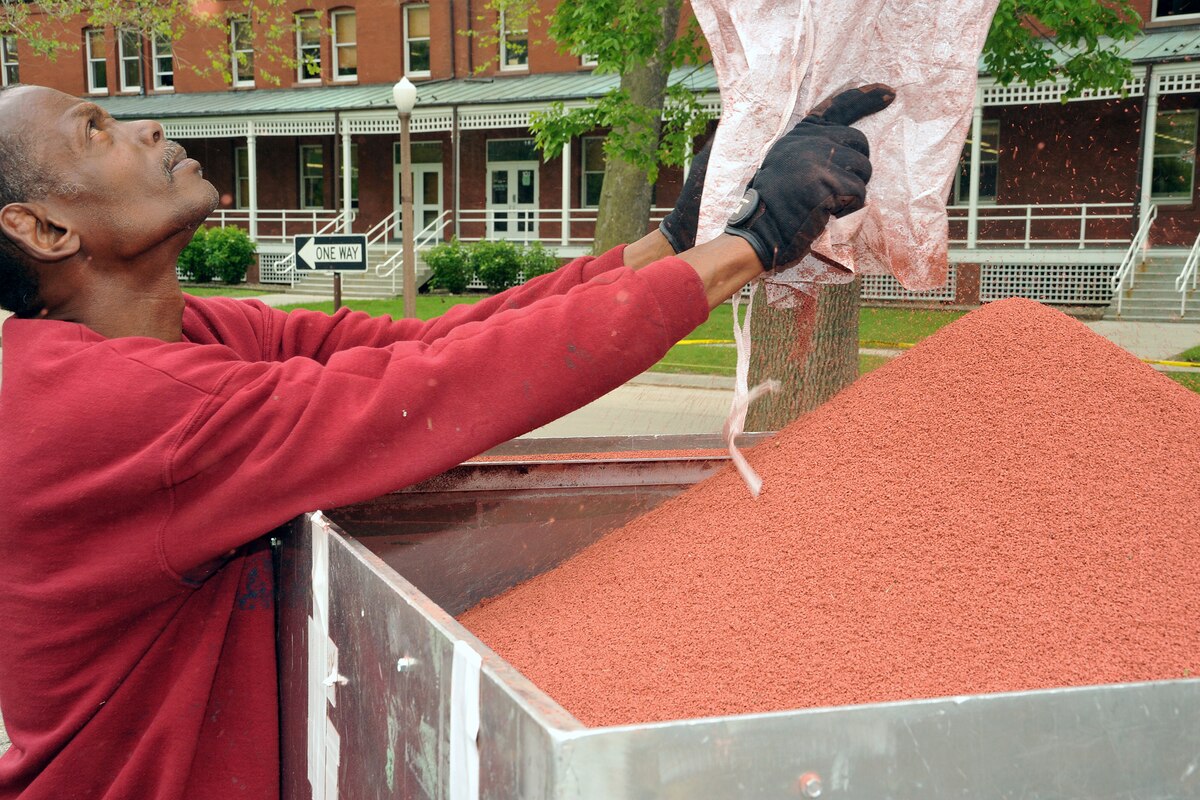 OFFUTT AIR FORCE BASE, Neb -- Gene Degraffenreaid of Bynon Sports, guides the bag that dispenses rubber particles into a wheel barrel at parking lot adjacent to the parade field at Offutt Air Force Base on May 18. Bynon Sports, which is located in Hunt Valley, Maryland was contracted to cover the concrete track at the Offutt parade field with a rubber surface. U.S. Air Force Photo by D.P. Heard