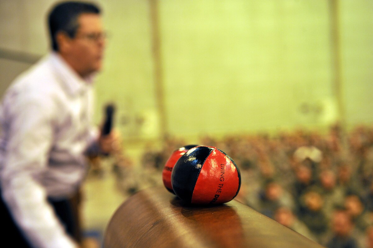 OFFUTT AIR FORCE BASE, Neb. -- Members of the 55th Wing juggle balls during a 55th WG Wingman Day 2010 commander's call Nov. 12 in the Bennie Davis Maintenance Facility's Dock One. Airmen in the 55th Wing took part in various events and briefings during the day to promote teamwork and educate Airmen on topics such as suicide prevention and the dangers of drinking and driving. U.S. Air Force photo by Charles Haymond