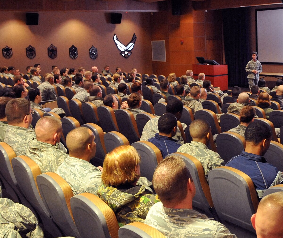OFFUTT AIR FORCE BASE, Neb. - Lt. Col Dana McCown, 55th Maintenance Squadron commander, speaks to a room full of 55th Wing Airmen Nov. 12 about the devasting effects a drunk driver has had in her life. Both of her parents were killed when a drunk driver ran into their vehicle a few years ago. The presentation was one of several events and briefings during Wingman Day 2010 to promote teamwork and educate Airmen on such things as suicide prevention and the dangers of drinking and driving. U.S. Air Force photo by Jeff W. Gates.