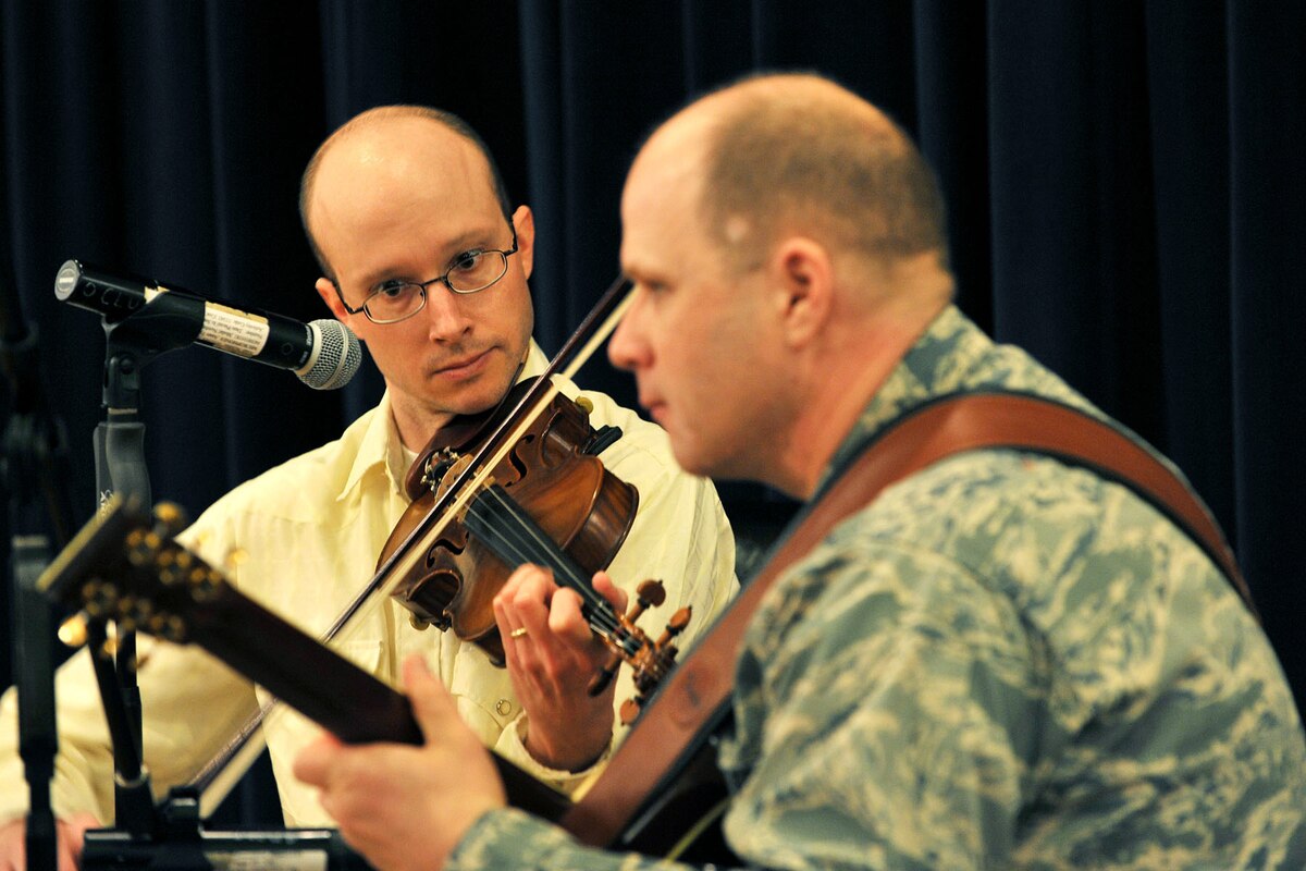 OFFUTT AIR FORCE BASE, Neb. -- Thad Miller, a local musician and Chaplain (Capt.) Shannon Workman, 55th Wing chaplain, entertain the crowd during the National Prayer Luncheon at the Patriot Club here March 3. Throughout the event many members of Team Offutt representing different faiths and backgrounds came together to pray for the warriors fighting for America, as well as their families. U.S. Air Force photo by Charles Haymond