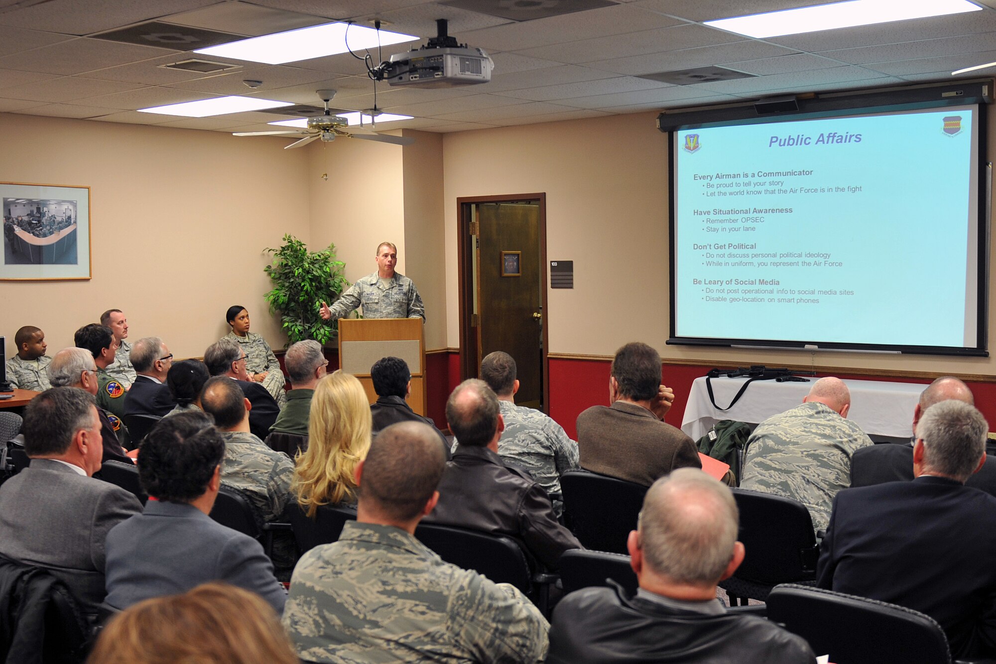 Offutt's Honorary Commanders Participate in Deployment Exercise Published April 1, 2014 By 2nd Lt. Carly A. Costello 55th Wing Public Affairs OFFUTT AIR FORCE BASE, Neb. -- The 55th Wing hosted 30 members of the Offutt Advisory Council for a mock-deployment exercise March 25 at the 55th Logistic Readiness Squadron's Personnel Deployment Function facility. The goal of this exercise was to give the OAC a better understanding of what the military members at Offutt go through as they prepare for a deployment and to give these community members an idea of how they can continue to support the military members on base and their families. "We wanted to start with the deployment because this is where your interests and ours as commanders probably overlap the most and that is with our Airmen and their families," said U.S. Air Force Col. Gregory Guillot, 55th Wing commander. "I hope we can all figure out better ways to support those young Airmen and their families." Upon arrival, each OAC member was given a folder, similar to what a military member would receive before deployment, which included a deployment tasking memorandum, a health record, fitness documentation and dog tags, just to name a few. "We organized different mobility folders for each person with all of their training, we made dog tags, we basically gave them all the information a deployer would have so they could see exactly all the training and predeployment requirements that military members have to go through," said 1st Lt. Dominique Lewis, 55th Force Support Squadron. "We also took them through the PDF line to show them the process and how we ensure that each military member is eligible to deploy." After receiving their folders, each member was escorted through the Passenger Travel Office where they were briefed on the amnesty box, which is a locked container where deploying members can discard any prohibited items before going through security, and the scales and how both luggage weight and body weight are recorded before going through a metal detector and taking their seats in the briefing room. Once in the briefing room, the OAC members met with group and squadron commanders from across the wing as well as several of the Offutt partner units such as the Air Force Weather Agency. Guillot then gave an introduction describing the PDF line and why it's important for the community to know what Offutt's military members go through. "We wanted to start with the deployment line so you can see the perspective from a military member leaving and also some reminders of what their family and friends that remain behind are going through and how we can support them while their military members are deployed," Guillot said. Similar to what each military member goes through when deploying, the OAC members received multiple briefings. This included intelligence, which told the members where they will be going and why, medical, Airman and Family Readiness Center, which covered programs that are available to not just the members deploying but also their families, finance, legal, chapel and public affairs. "As a civilian it is so good for use to hear and see what each Airman has to go through before they deploy," said Rita Sanders, Bellevue mayor. "The process is long, the process is grueling. It takes a lot of days, hours of their lives to be prepared and ready to go. Most civilians don't know that... [military members] have to ready at all times." Overall, the members enjoyed the event and found it beneficial to what they do with the OAC. "I enjoy learning about the process and how it works and how much work goes into getting people deployed," said Tom Richards, OAC member and 55th LRS honorary commander. "It's a tremendous effort to organize and get this many people out the door with everything that they need." "I wish more people were able to see this so they can understand what [the military] does for us," said Lyle Ward, OAC member and 55th Wing director of staff honorary commander. "You sometimes forget about what they leave behind. It's going to make me more aware of what I need to do to step up for my neighbors who are military." OAC President John Hansen along with the 55th Wing want to see more events like this in the future. "It really gives our folks a real eye-opening experience of what goes on here at Offutt and what's involved in a deployment," Hansen said. "Hopefully we can do some things from our side and have the military members come out to see some of the things we do in our community." The wing plans to host events with the OAC quarterly in the future. Already planned is the OAC Annual Membership meeting on May 9 and the OAC Appreciation Picnic on June 6. "Supporting the base is the key thing, and there are a lot of things that private civilians can do that the military doesn't have the ability to do, especially raising money for the family support efforts," Richards said. "We have been very actively involved in that and hope to continue to do so." The OAC is a non-profit organization comprised of local community and business leaders that was formed in 1992 with the purpose of building the bonds between the base and local community.