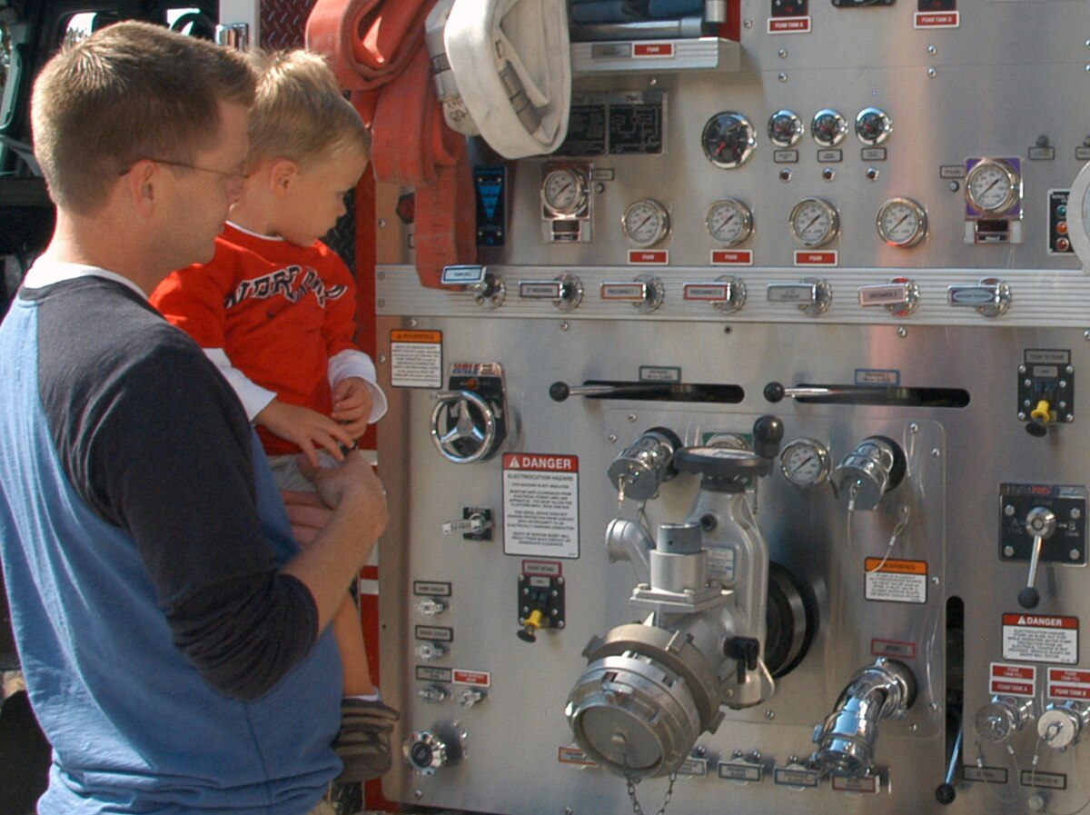 OFFUTT AIR FORCE BASE, Neb. -- Rob Pugsley a contractor at U.S. Strategic Command shows his son Colby, age two, the instrument panel of one of the many fire trucks on display for children to see. Children were allowed to sit in the driver’s seat and roam inside the vehicles. There were also other various training stations for children including a smoke house, water hose handling and displays to encourage and educate children during the 2008 Offutt Firestation Open House Oct. 11. (U.S. Air Force Photo By Jeff Gates)