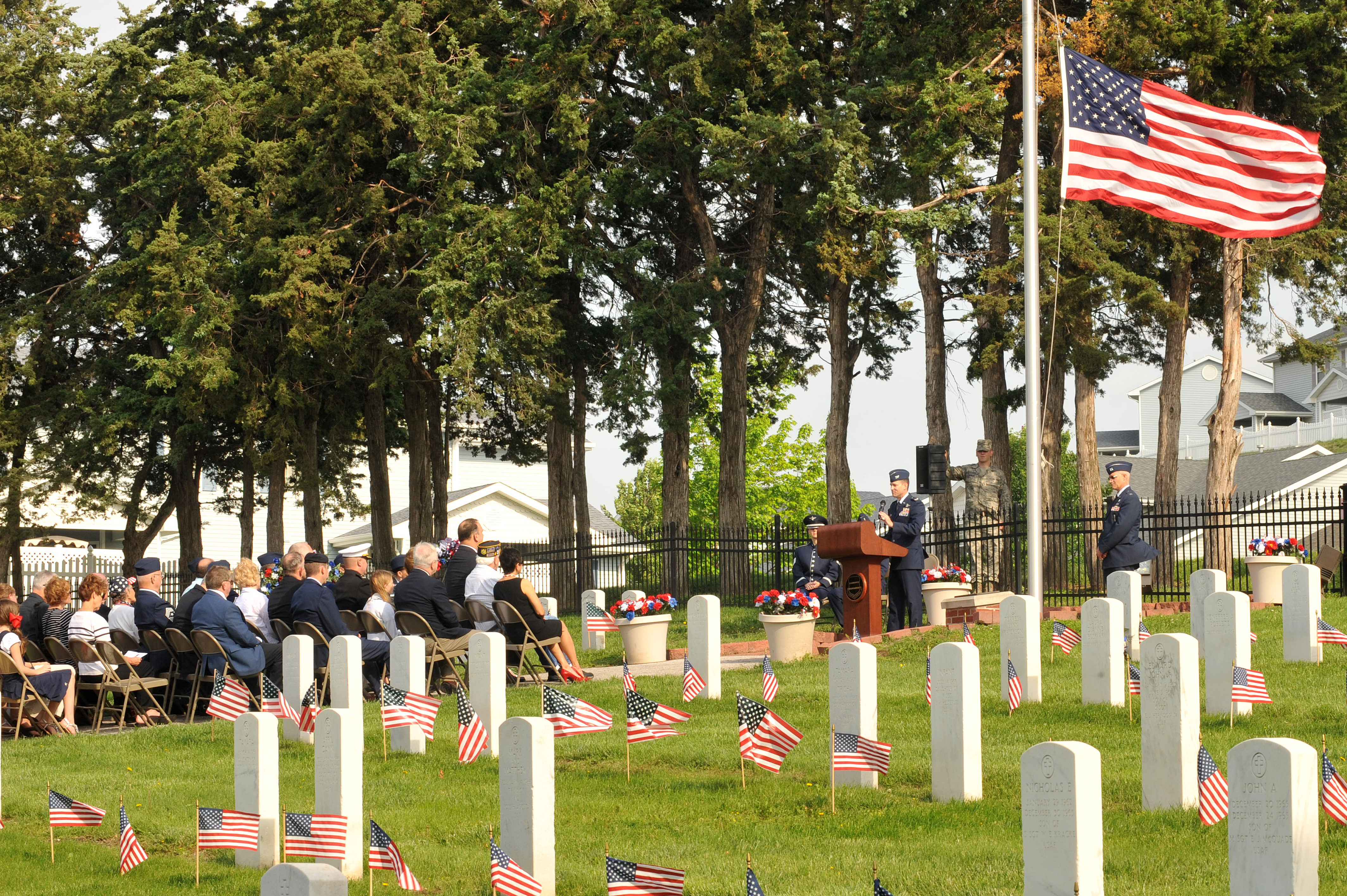 OFFUTT AIR FORCE BASE, Neb. - Col. William P. Jensen, 55th Wing vice commander, speaks to members of the Offutt community at the annual Memorial Day service held at the Offutt Air Force Base cemetery May 30th. The Memorial Day service is held annually to honor veterans from all eras who have served our nation. Air Force Photo by D.P. Heard