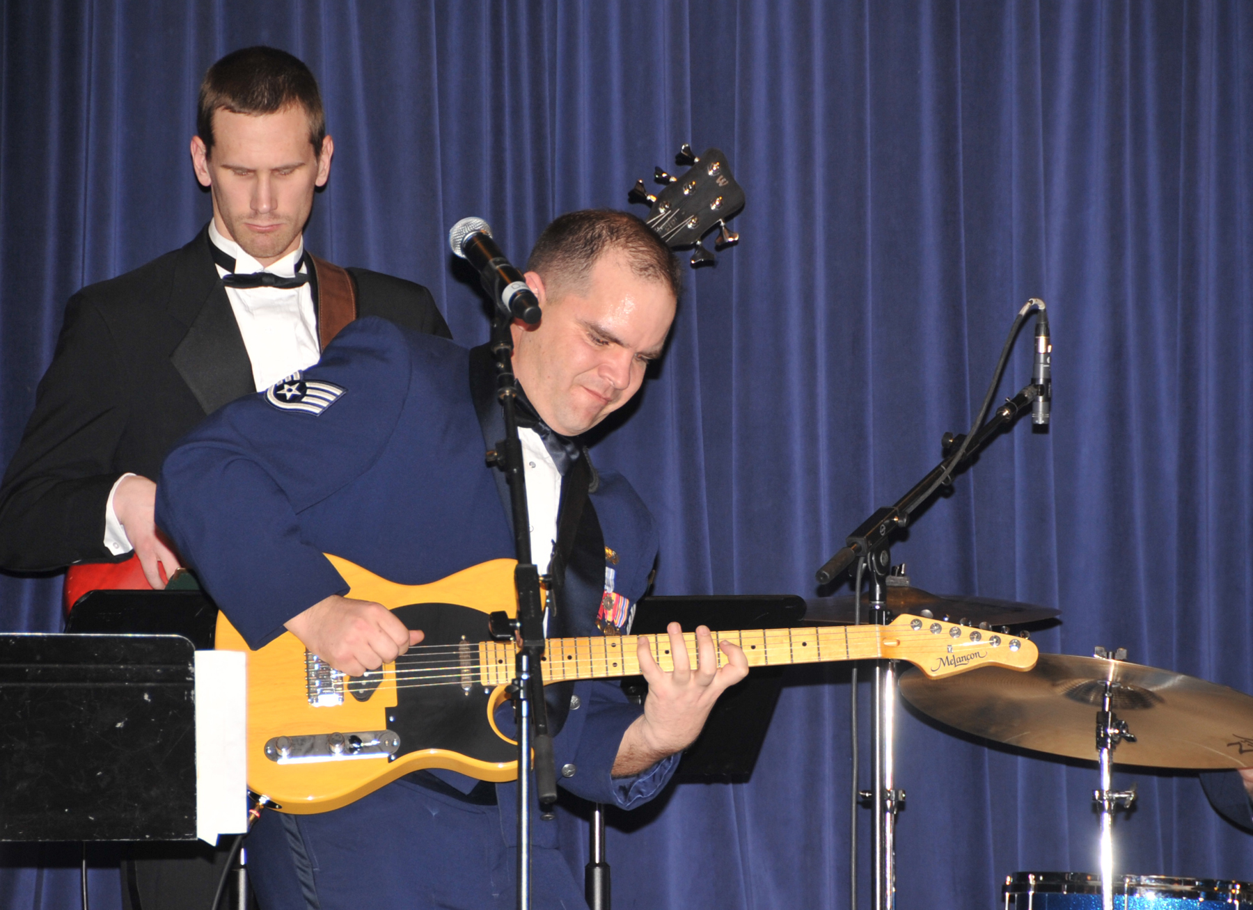 OFFUTT AIR FORCE BASE, Neb. - Staff Sgt. Ryan Manzi, a guitarist with the Heartland of America Band's ensemble "Raptor," plays a guitar solo during the group's performance at the Patriot Club here Feb. 26 during the 55th Wing Annual Awards Banquet. U.S. Air Force photo by D.P. Heard
