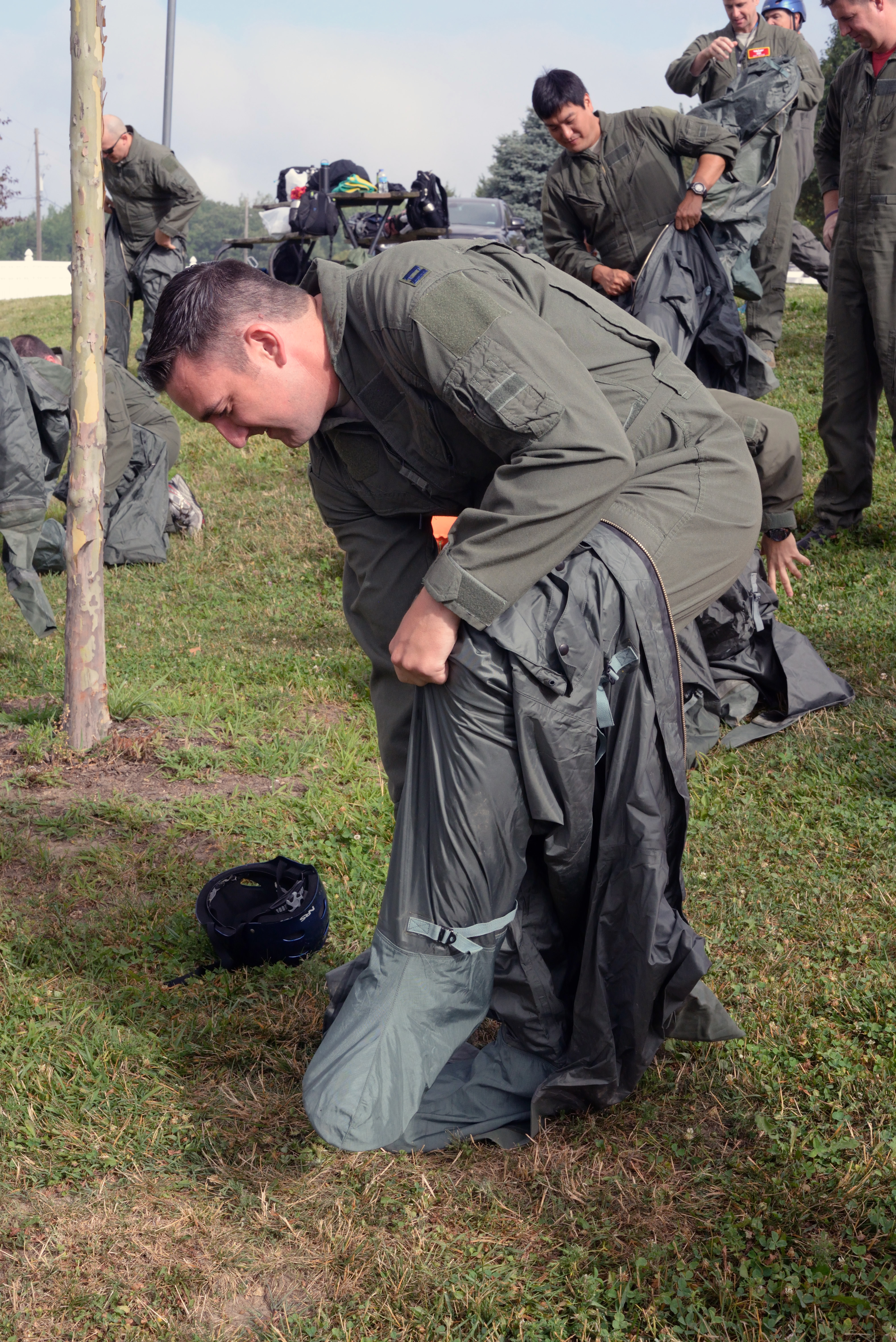Capt. John Sankey, a Citizen Airman and member of the 170th Group assigned to Offutt Air Force Base, Nebraska, dons an anti-exposure suit while participating in water survival and rescue training July 14, 2018. The suits are worn by aircrew in the eventuality they must be in water where the temperature is below 60 F. The air crew members were briefed on the availability and use of tools contained in their survival gear before putting academics and theory to the test in the waters of a local lake.