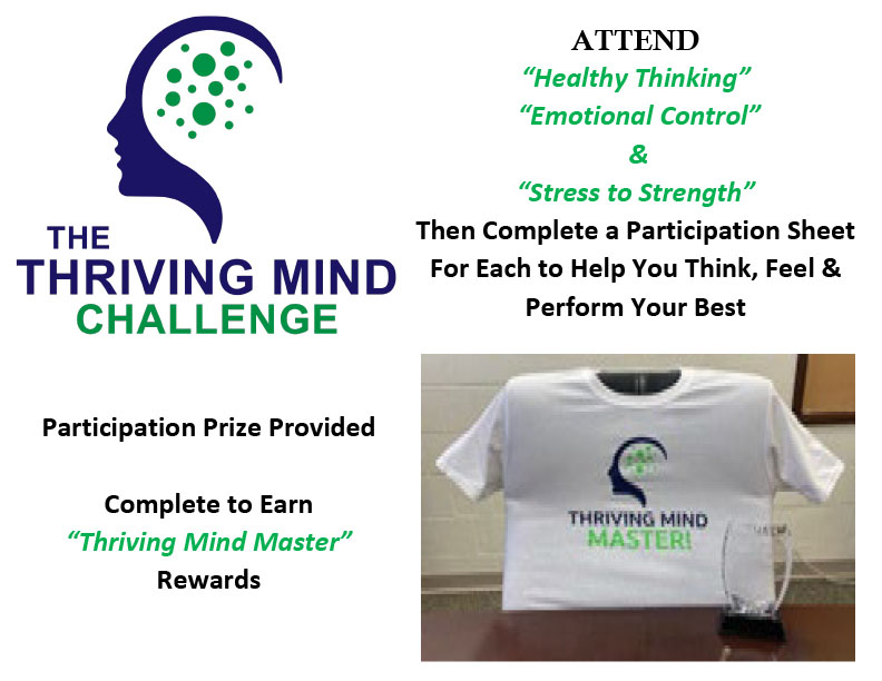 Start by participating in any of the three following classes; Healthy Thinking, Emotional Control or Stress to Strength. Each class provides a participant workbook with several one-time tasks that once completed, will have you thinking, feeling, and performing better each and every day. Successful challenge goers graduate as a “Thriving Mind Master” and are awarded the following: A Thriving Mind Master Trophy and T-shirt.